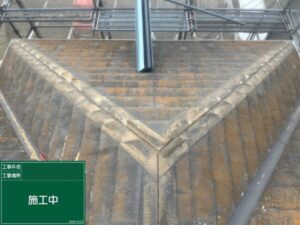 こちらにもその棟板金が設置されていましたが、今回屋根材を既存屋根の上から新しいものを設置する「カバー工法」をさせていただくため、新しい屋根材に干渉しないよう最初に外していきます。