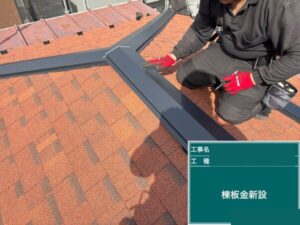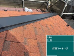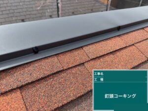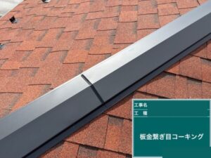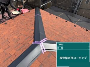 棟板金の繋ぎ目にはコーキング材を充填し、雨水の侵入を防いでいます。