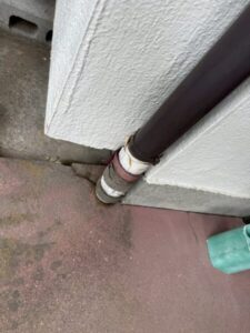現地で拝見させていだきましたが、以前雨樋交換をした別の業者が雑に取り付けていたようで、もともと竪樋の一番下、地面とくっついている部分がしっかりとはまっていませんでした。