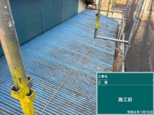 現地で確認させていただくと、錆びもひどく、また、台風のときに屋根材が二枚剥がれ、落下している状態でした。