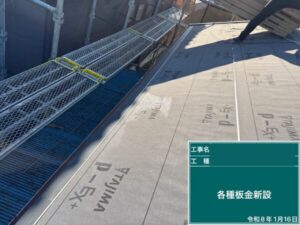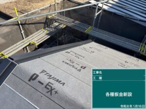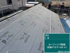 こちらに使用しました田島ルーフィングの「PカラーEX⁺」はとても人気のルーフィングシートで、耐熱性、耐候性、耐熱性に優れています。