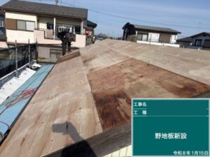 下地材も腐食していましたので、下地の野地板から新しく交換する「葺き替え」工事をご提案。