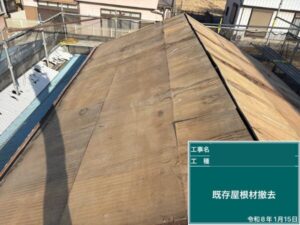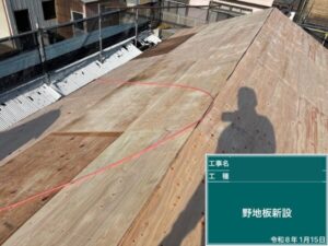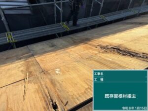 今回は下地がすでに劣化し、穴まであいている状態でしたので、新しく下地から設置しなおし「葺き替え工事」をおこなっていきます。