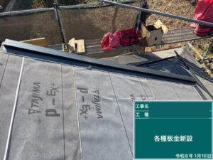 屋根と外壁の繋ぎ目、取り合い部分と言われる箇所にも、土台の貫板を設置の上、こちらも専用の板金でカバーしていきます。