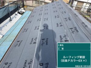 こちらに使用しました田島ルーフィングの「PカラーEX⁺」はとても人気のルーフィングシートで、耐熱性、耐候性、耐熱性に優れています。