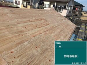 下地材も腐食していましたので、下地の野地板から新しく交換する「葺き替え」工事をご提案。