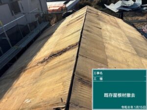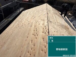 今回は下地がすでに劣化し、穴まであいている状態でしたので、新しく下地から設置しなおし「葺き替え工事」をおこなっていきます。