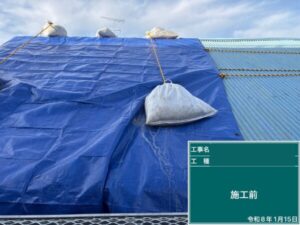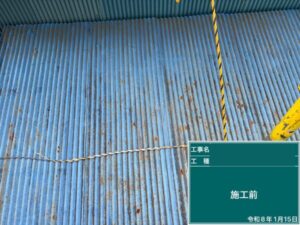 現地で確認させていただくと、錆びもひどく、また、台風のときに屋根材が二枚剥がれ、落下している状態でした。