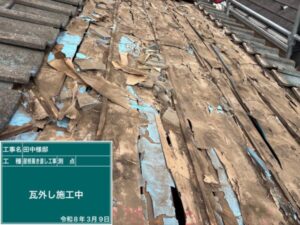 瓦の撤去を行うと、下地がボロボロになっているのが見えてきます。