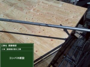 屋根の土台としてコンパネを新設する工程が、初めの取り付け作業です。