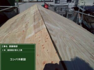 屋根の土台としてコンパネを新設する工程が、初めの取り付け作業です。